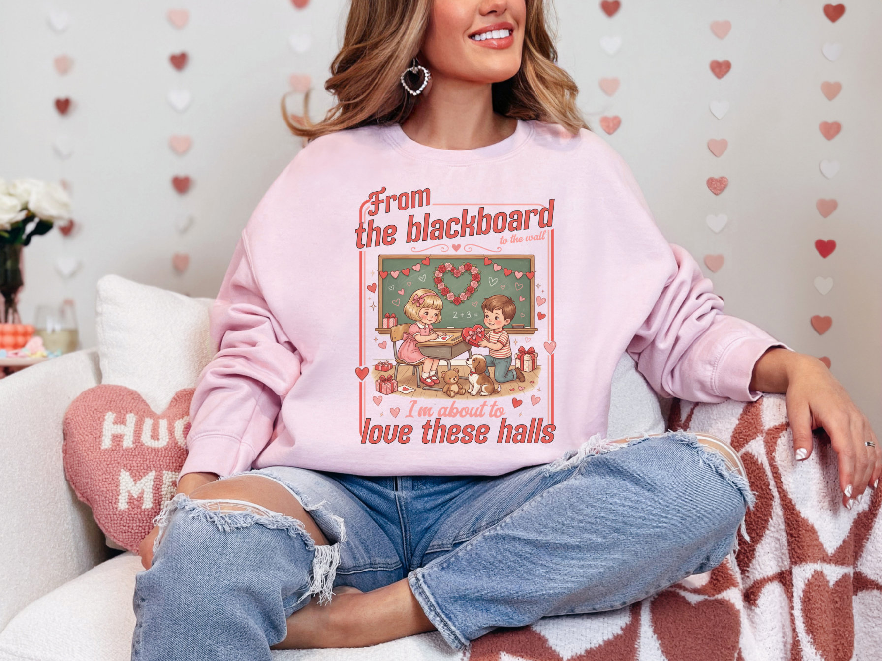 FROM THE BLACKBOARD TO THE HALLS VALENTINE TEACHER CREWNECK SWEATSHIRT is printed on sand, ash, white, or light pink colored cozy crew