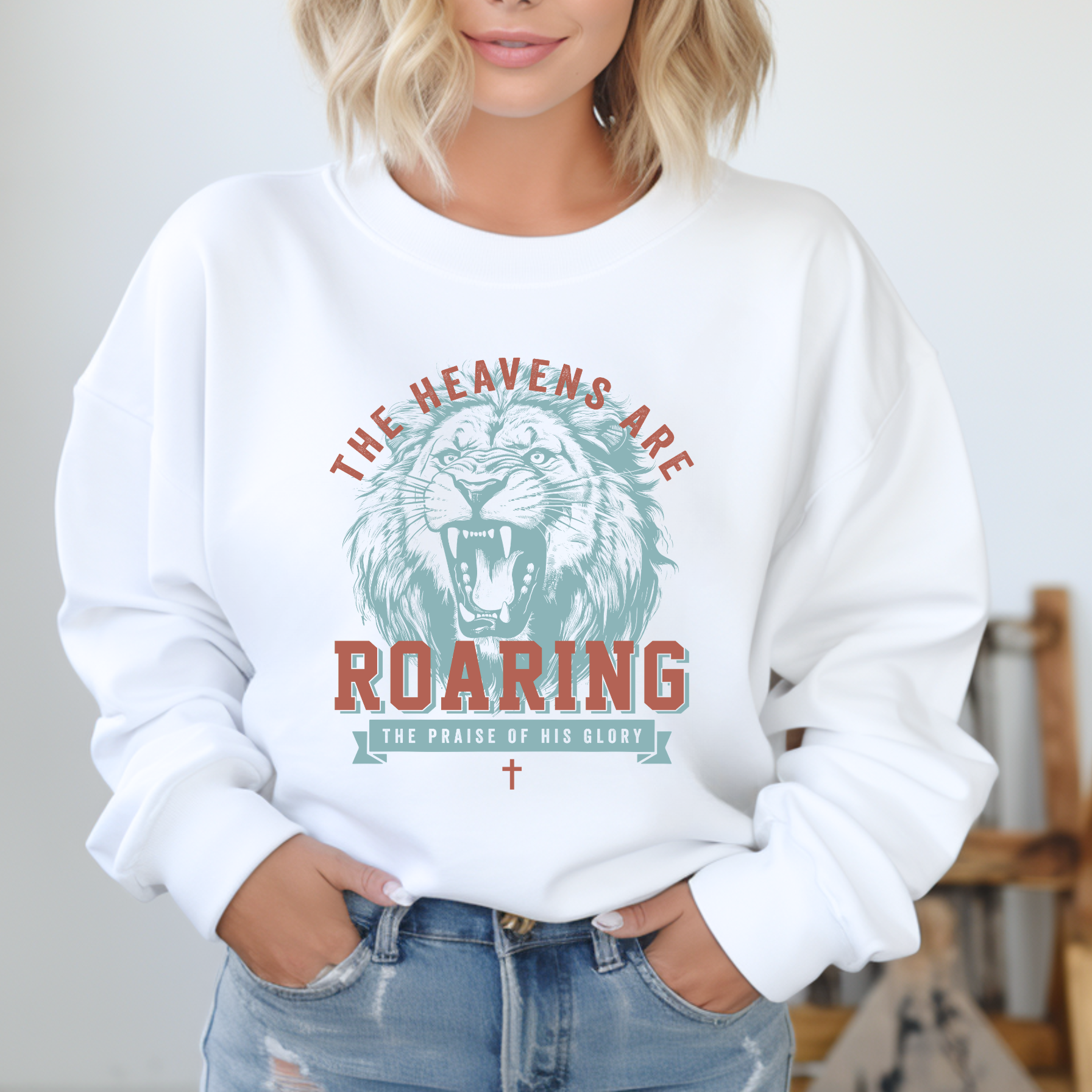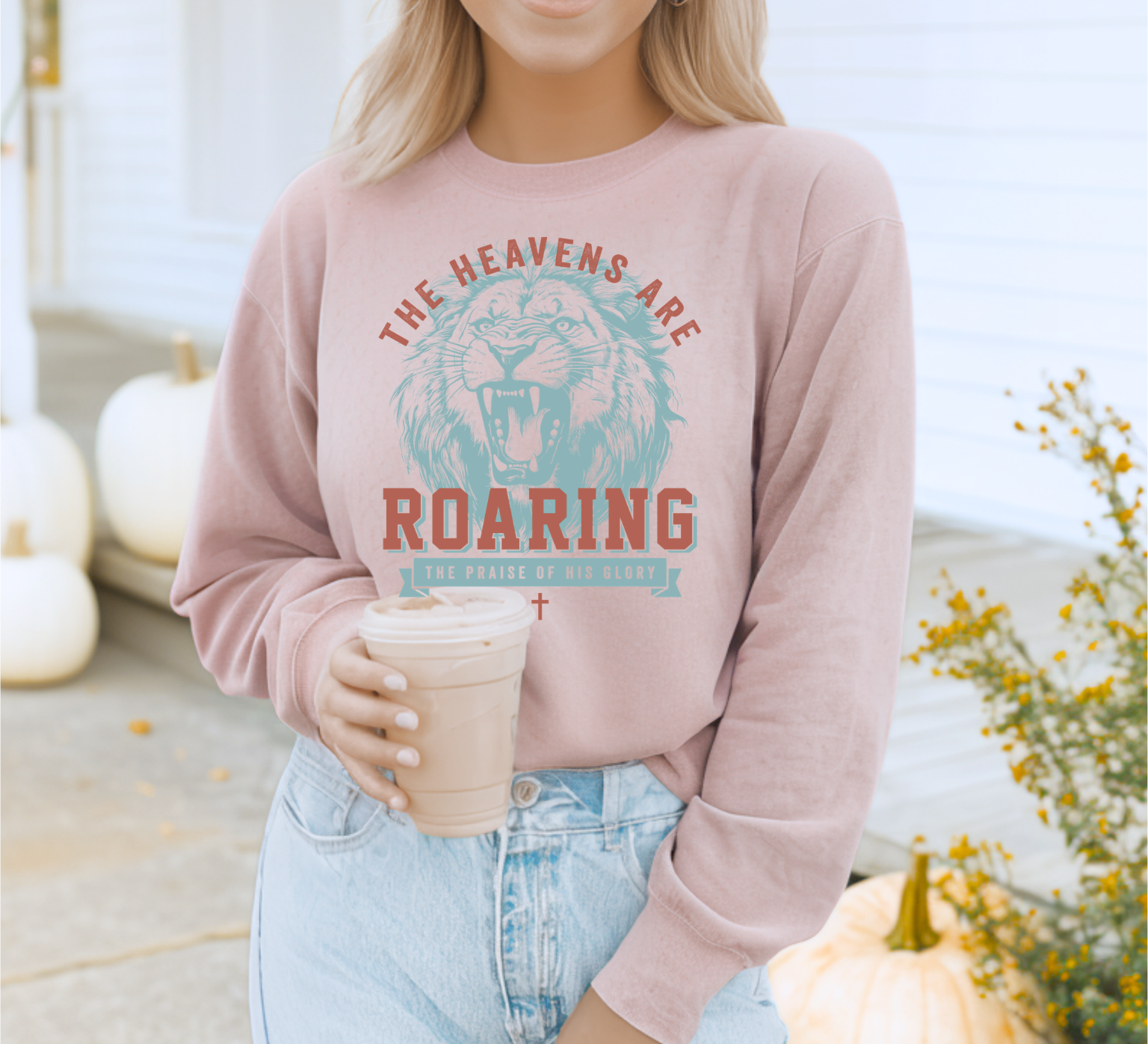 THE HEAVENS ARE ROARING CREWNECK SWEATSHIRT is printed on a sand, ash, cream, blushed pink or white colored on a 50/50 cotton polyester blend sweatshirt.